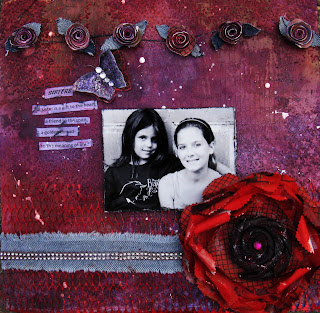 So I used 5 pieces of patterned paper (well 6 if you count the background paper), the splashes of paint, butterflies, denim (the letters are made of denim fabric), and I used brown tulle so I combined those two element together. The only thing I didn't use were the 5 lines of journaling.